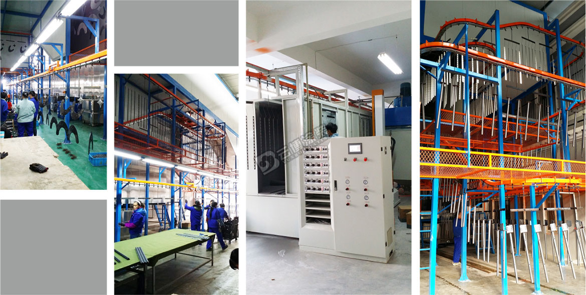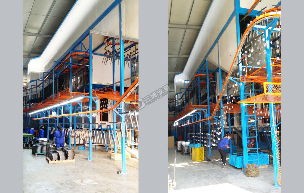 This coating line for the TV frame of the automatic coating line, the use of spray + immersion combined with the pre-treatment process, this line using three-dimensional space wiring, up and down three-tier equipment, equipment, the highest point of 11 meters high, Installation space.